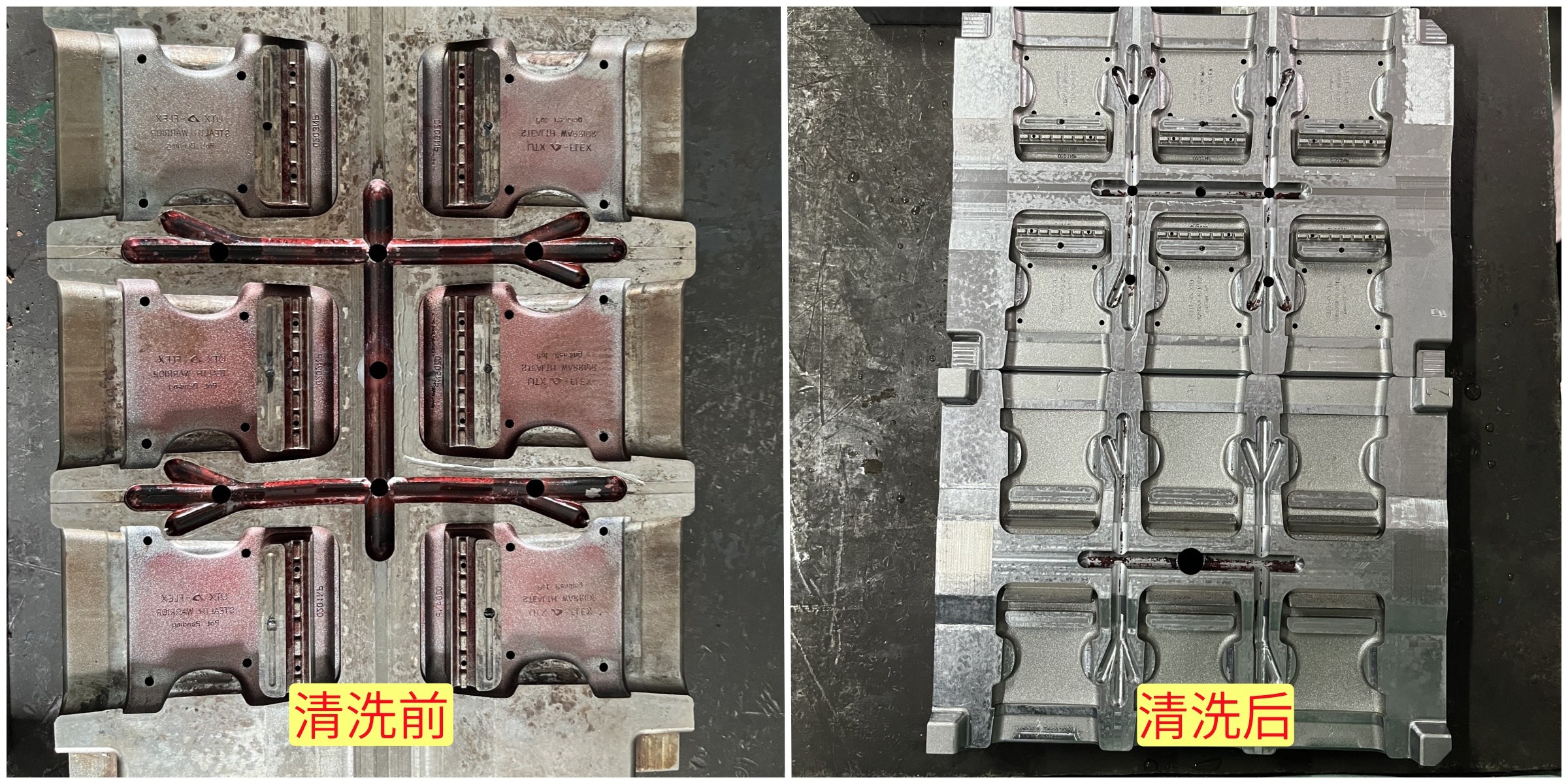 腐蝕性殘留物會加速模具鋼材的氧化,而硬質顆粒(如碳化物)在反復開合過程中會導致型腔磨損。實驗表明,未經潤滑的模具擦洗可縮短使用壽命20%-30%。采用電解模具清洗機能有效清除模具表面以及盲孔內的頑固污垢,同時避免對鏡面造成損傷。